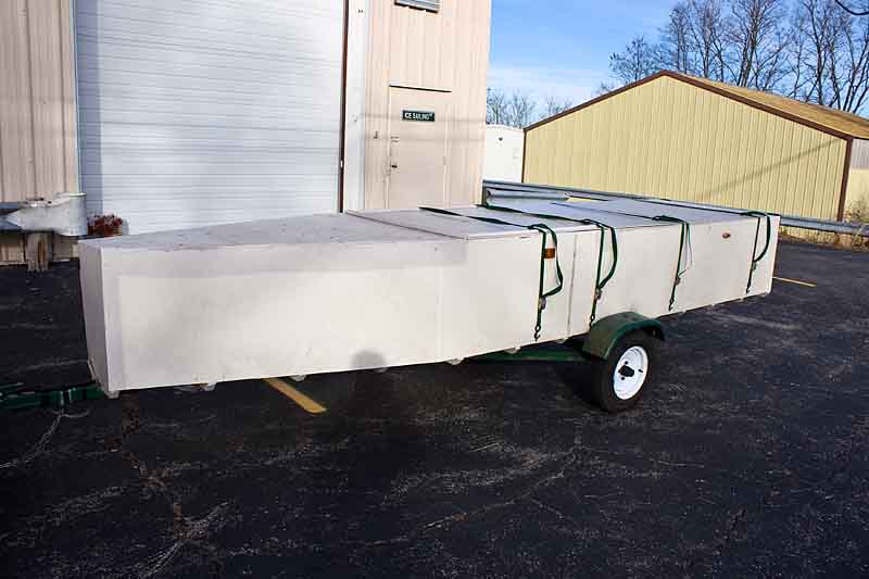 My goal was to have a trailer that would allow storage, setup, and tear-down of a single boat program quickly and eaisly. I also wanted to be able to store the bukly parts of a second DN program (sails, mast, plank, and boom) so that two could travel to a regatta without any major parts of the second DN program in the car (the hull of the second boat rides on the roof). This turned out to work well in 2009-2010 when I was able to help introduce Gavin Clarke, a new sailor in the Madison area, to iceboating with my spare DN (more about that).